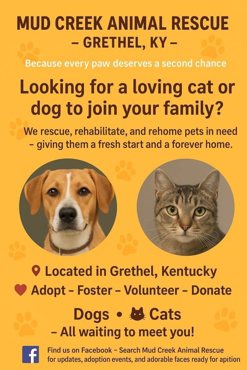 Our mission here at Mud Creek Animal Rescue is to work with our communities to provide a safe home for animals, finding loving forever homes, and advocating for animal welfare in our communities.